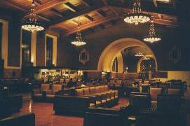 左:夜明け前の「ロスアンゼルス・ユニオン駅」・右:「待合室」風景