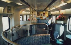 階下に下りる階段は直線になっていて、降りると電話とテーブル席があった。とても大きなビッフェ車である。でもお客はひとりもいなくて車掌がテーブルで新聞を読んでいるだけだった。