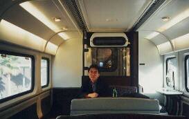 私は車両の真中にあるテーブルに腰掛けてみた。するとどうだろうビジネスクラスに座っているより眺めが良いのである。窓からはちょっと離れるがその分、右の車窓も左の車窓も見渡せる。