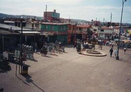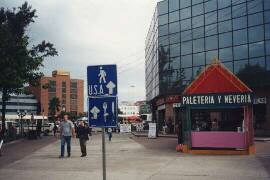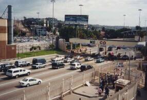 国境ゲートを越えるとタクシーの客寄せが目立つ。「ティファナ」の中心へはゲート前の少し大きな道路を横断し、その先のちょっと小奇麗な建物が並ぶショッピング街の一番奥にあるらせん状の坂を登り、川を越えた向こうである。