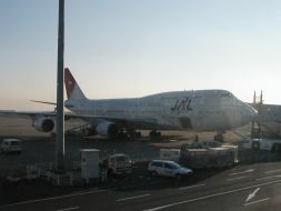 私の乗る日本航空8831便ソウル金浦行きの搭乗は7:50に開始されました。JAL8831便の駐機する3番乗り場の飛行機は、残念ながら待合室から見えなかったのですが、搭乗口に向かう通路からはよく見ることが出来ました。今日の機材はJA8911。ボーイング747−400型で翼の先に小さな補助翼のある国際線仕様の機体です。