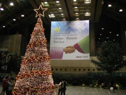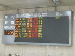 金浦空港に飾られたクリスマスツリー 後ろには羽田−金浦増便を祝う幕がかかっている | | 金浦空港国際線ターミナルの到着案内板 羽田からの便ばかり8便が並んでいる |